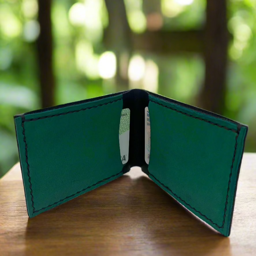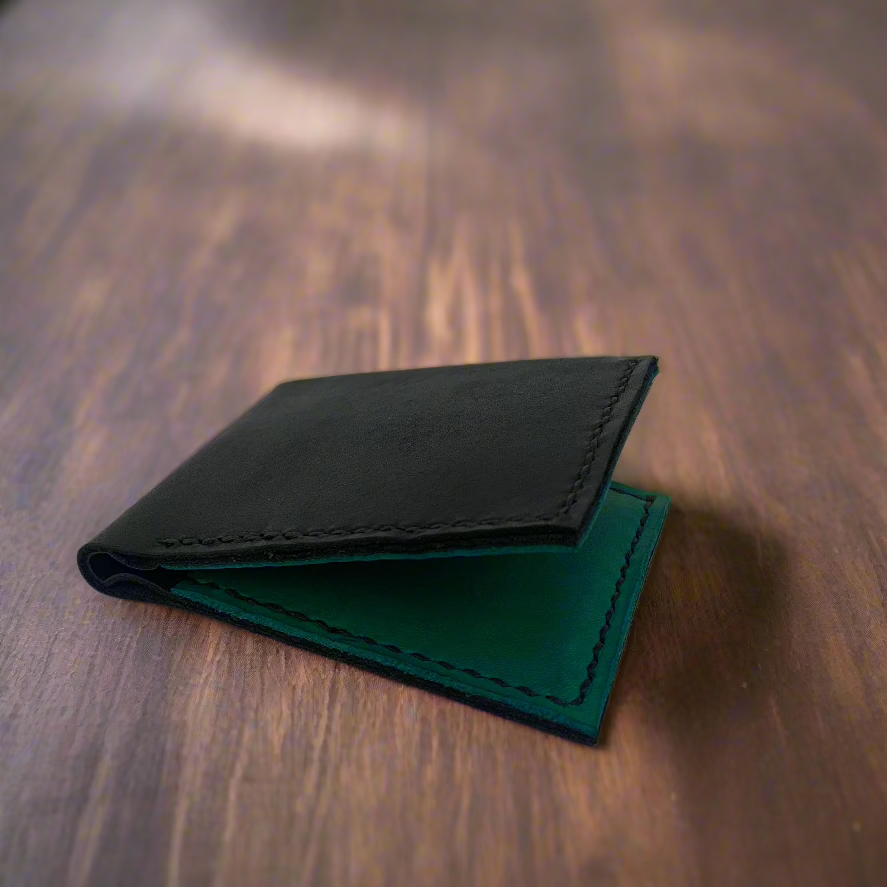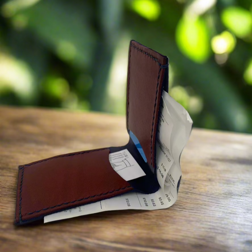 This classic billfold design is constructed out of full-grain leather and saddle stitched by hand to ensure a sturdy, long-lived product. This wallet features two card pockets and space for paper bills, receipts, etc.