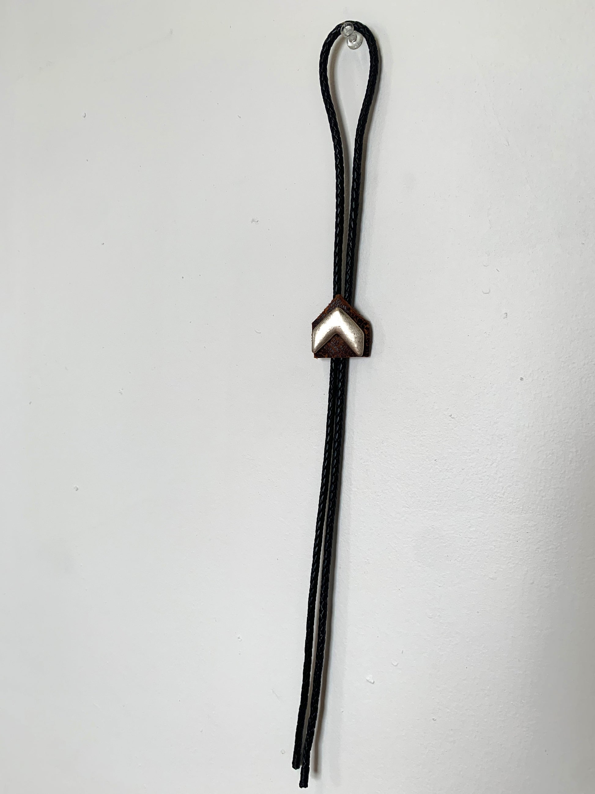 This hand made bolo tie features a braided black leather cord and a brown leather slide with a chevron ornaments.