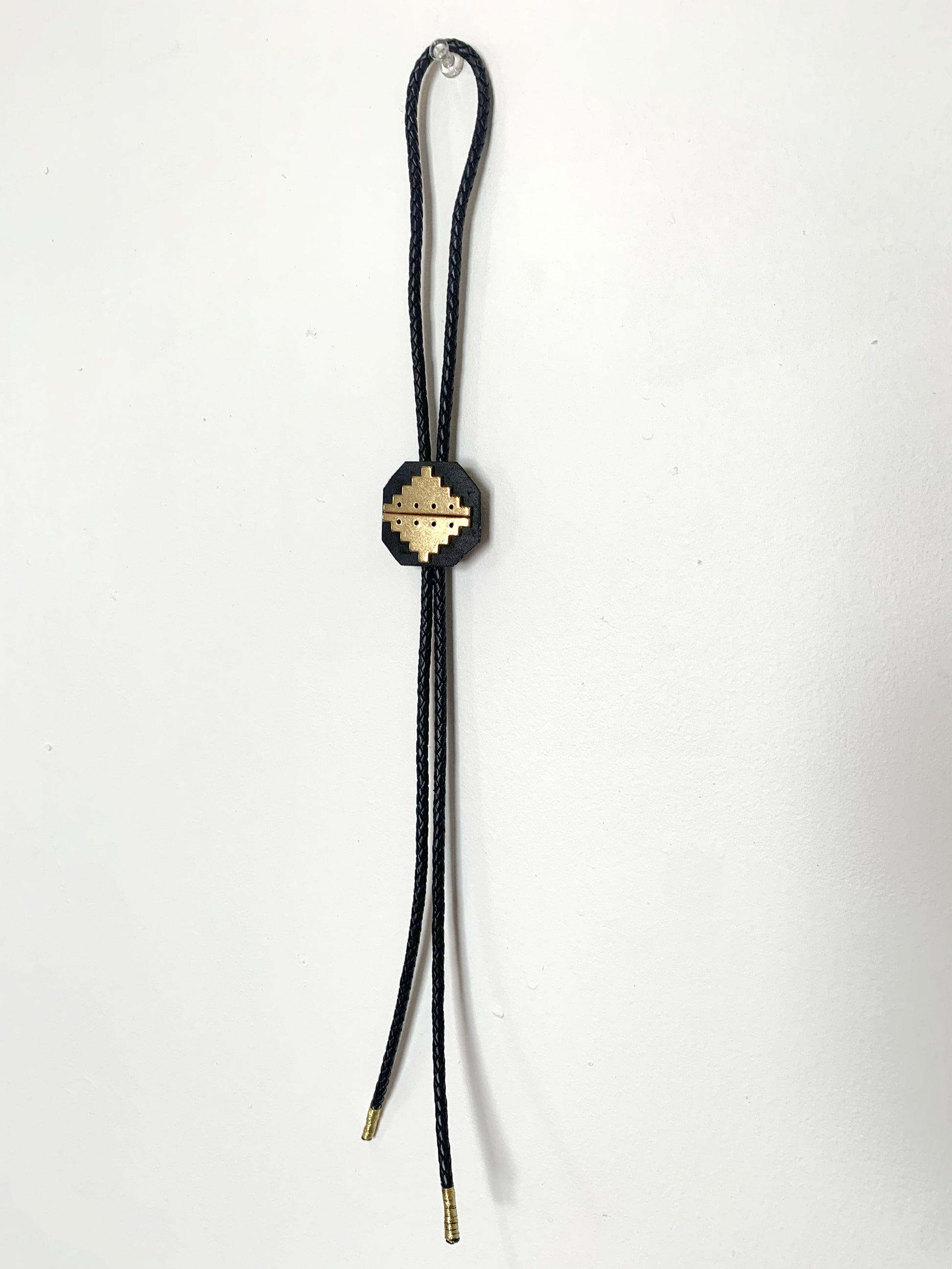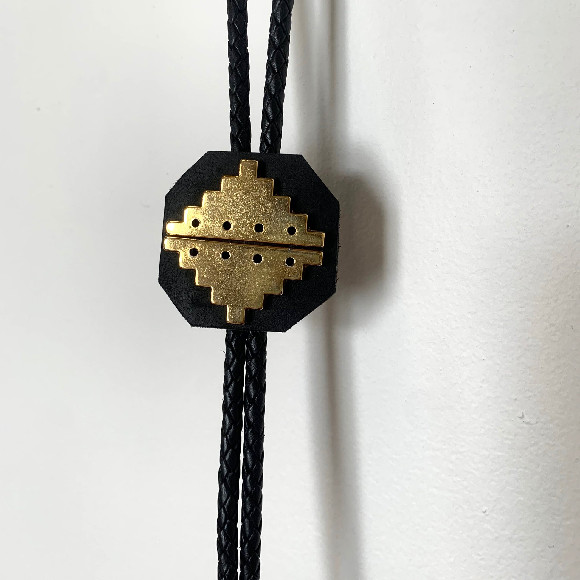 This hand made bolo tie features a braided leather cord and a leather slide with a step motif hardware.