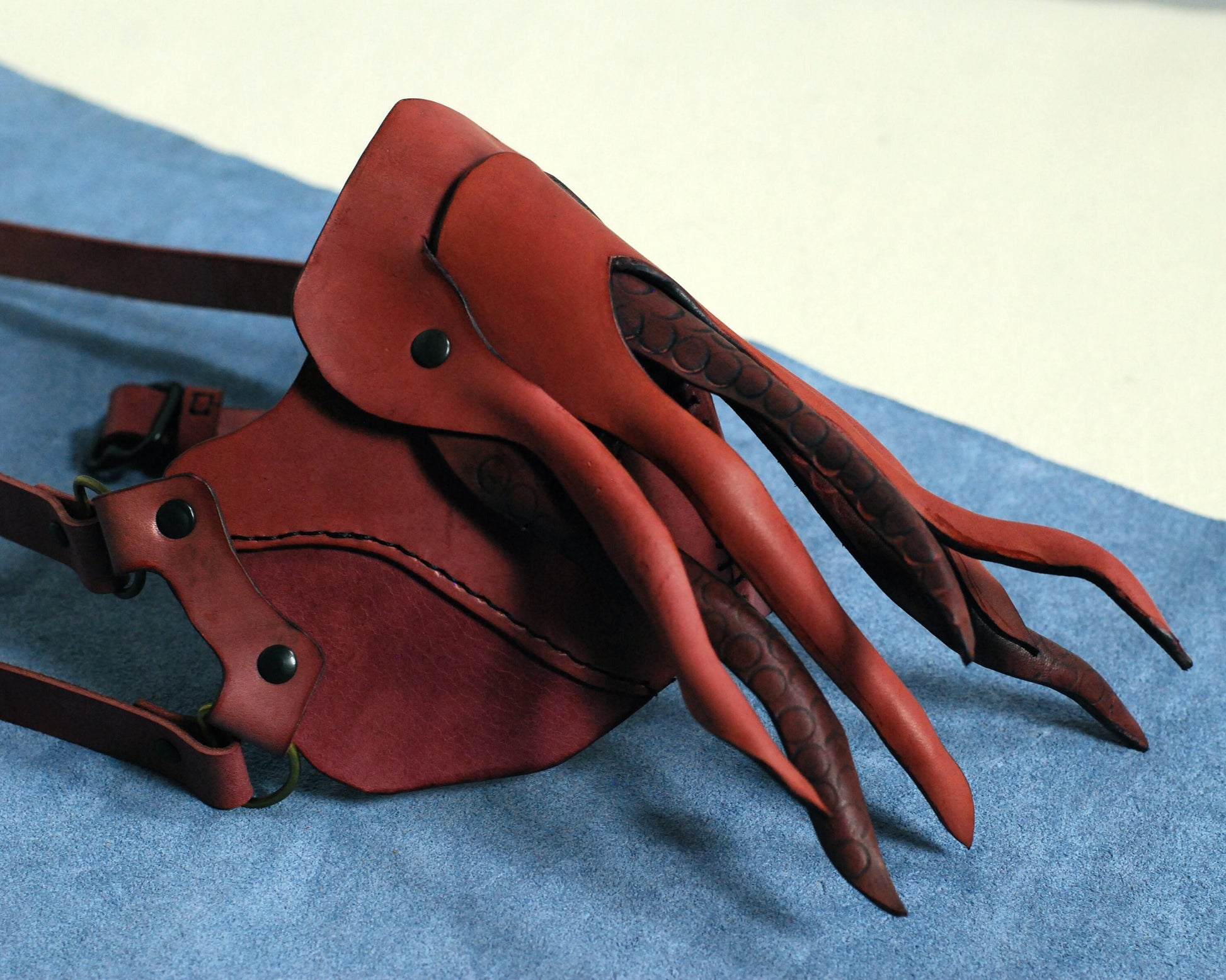 This mask is handmade from vegetable-tanned leather with solid brass hardware.