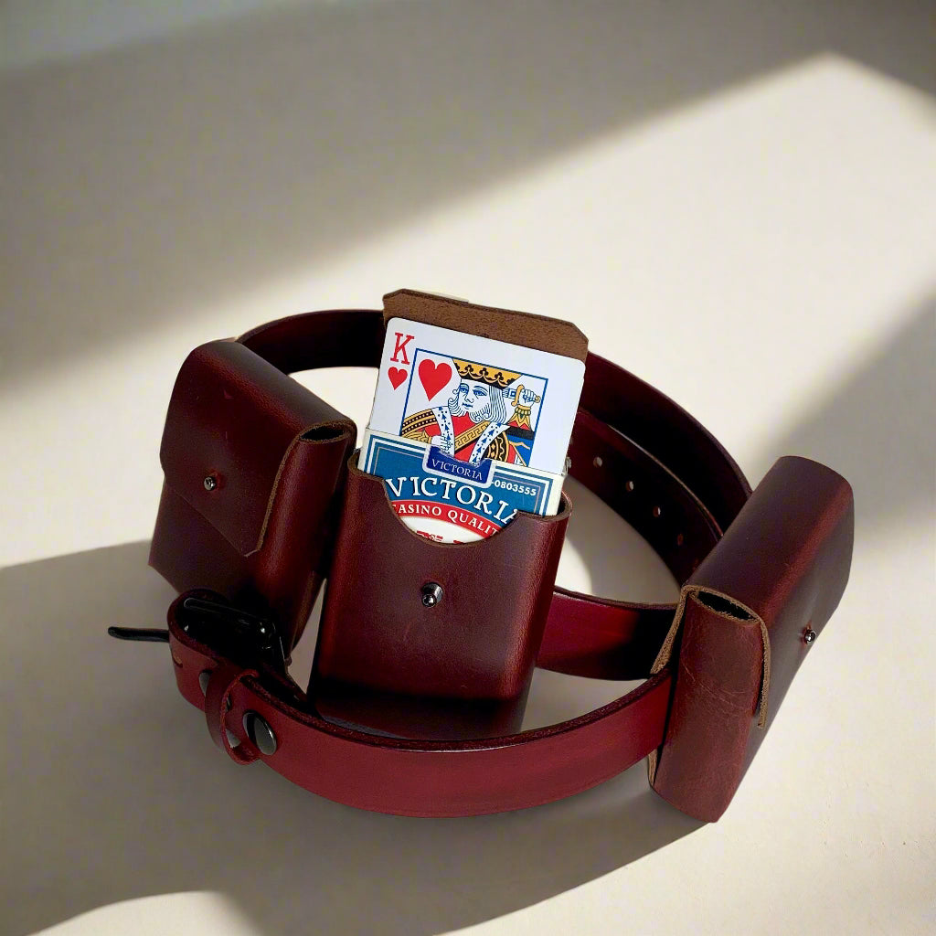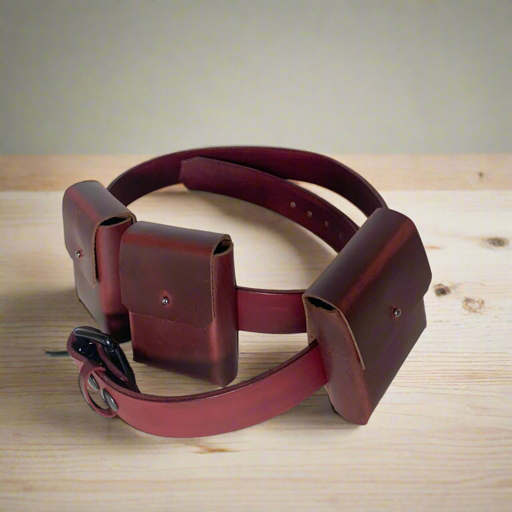 Includes: three leather pouched that slide on and can be adjusted or removed
